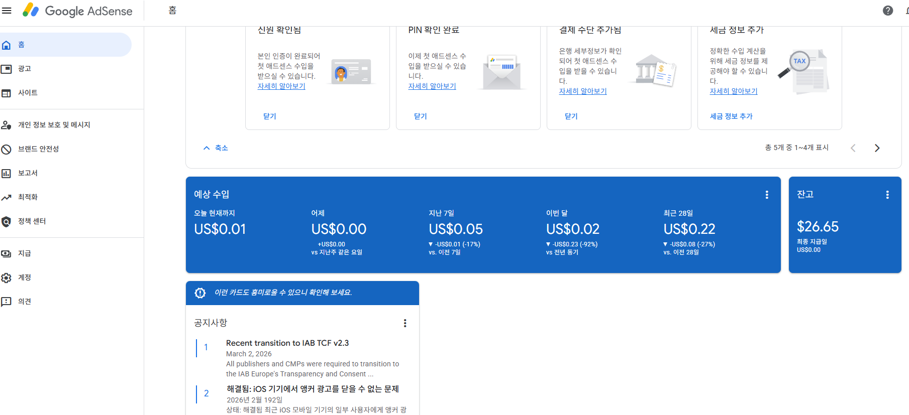 그리고 제 애드센스 수익은… 0.01달러였습니다.