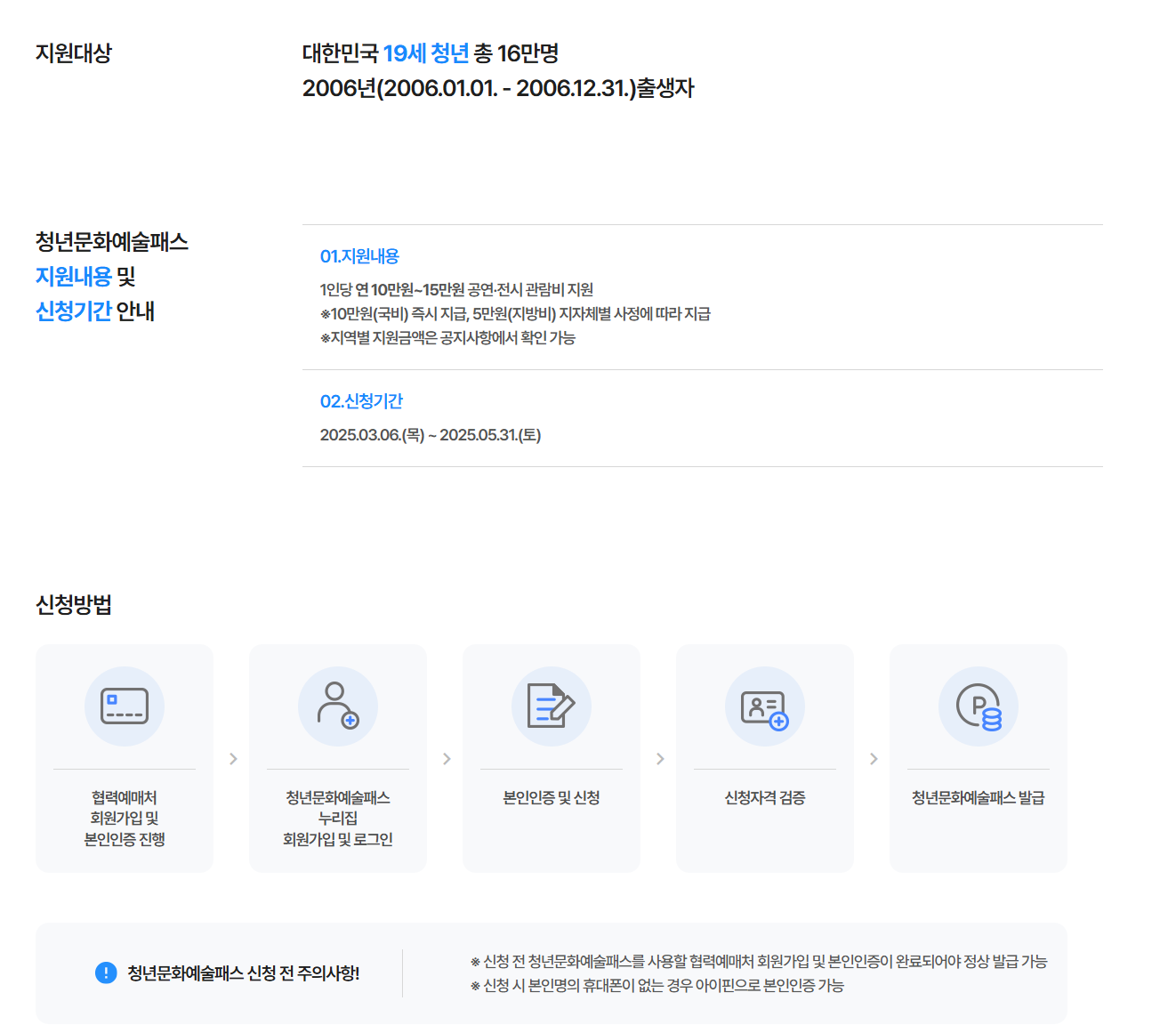 청년 문화예술패스는 2006년생(만 19세) 청년을 대상으로 공연·전시 예매 시 최대 15만 원까지 지원해주는 문화 체험 지원 제도입니다.