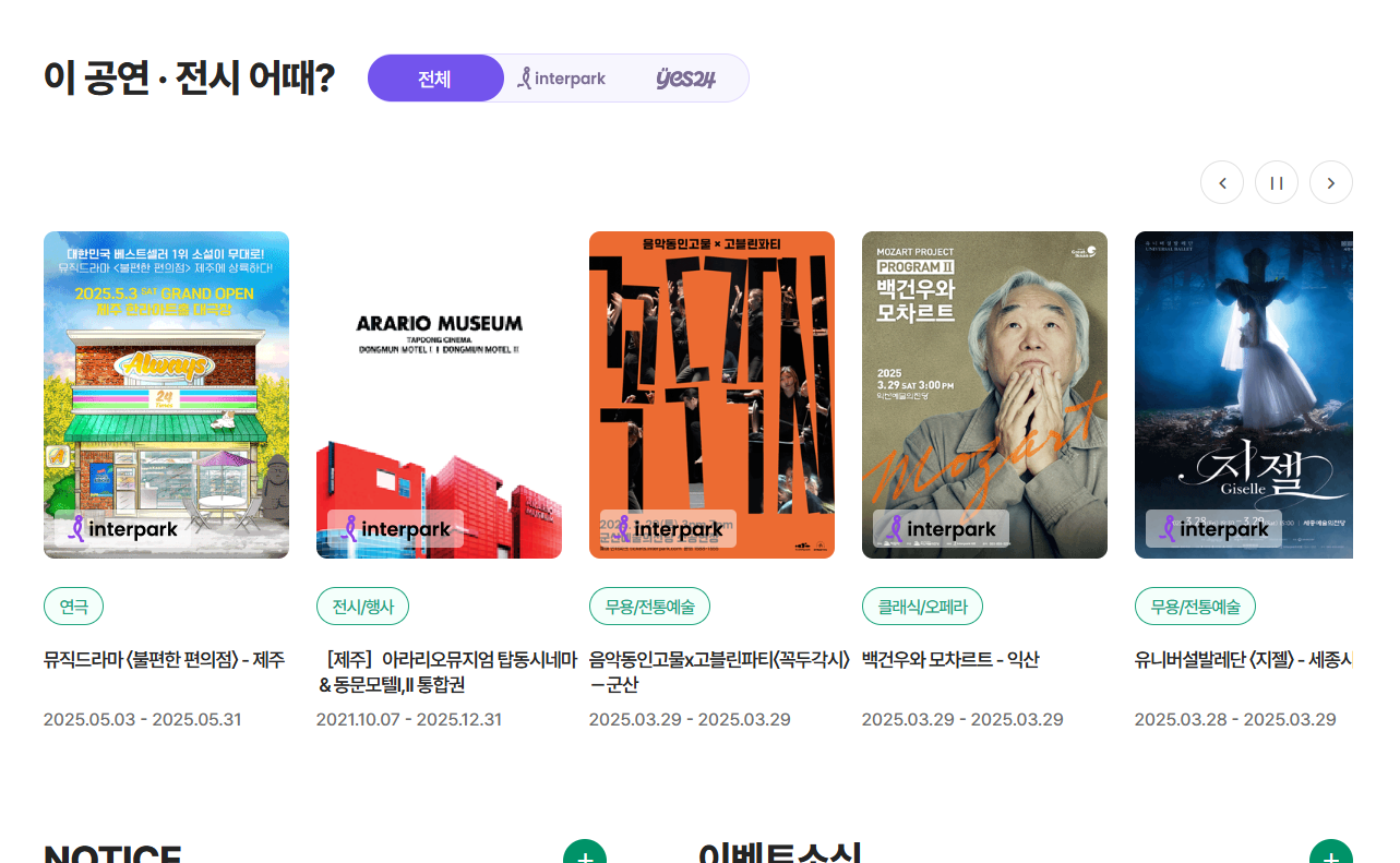 - 뮤지컬, 연극, 클래식, 콘서트, 전시 예매 가능