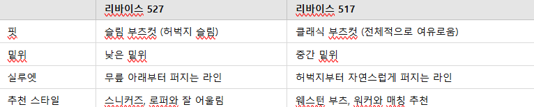 리바이스에는 527뿐만 아니라, 비슷한 느낌의 517 모델도 있습니다. 하지만 핏이 다소 다릅니다.