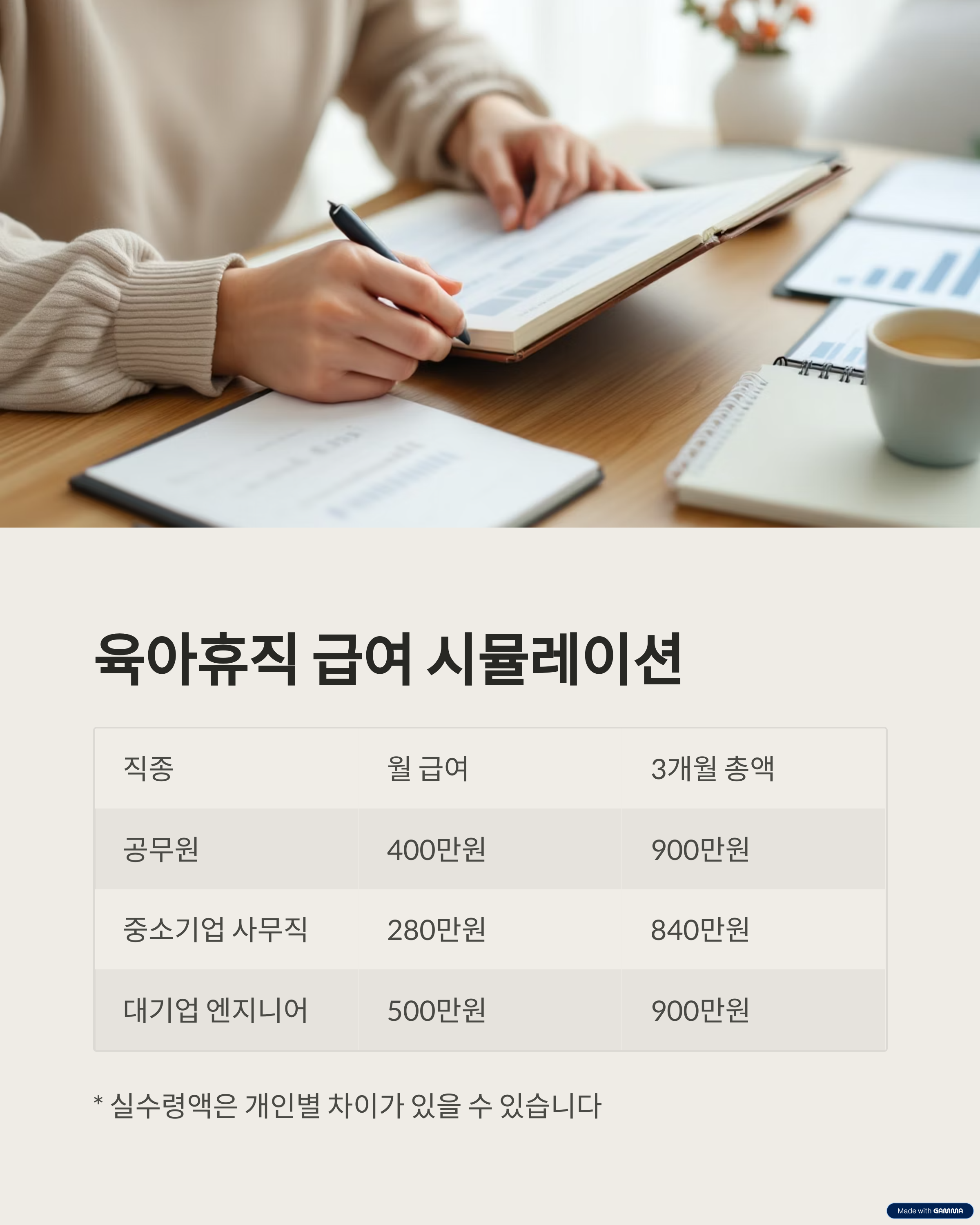 직종 월급여(세전) 육아휴직 3개월 총 수령액 연간 수령 예상액