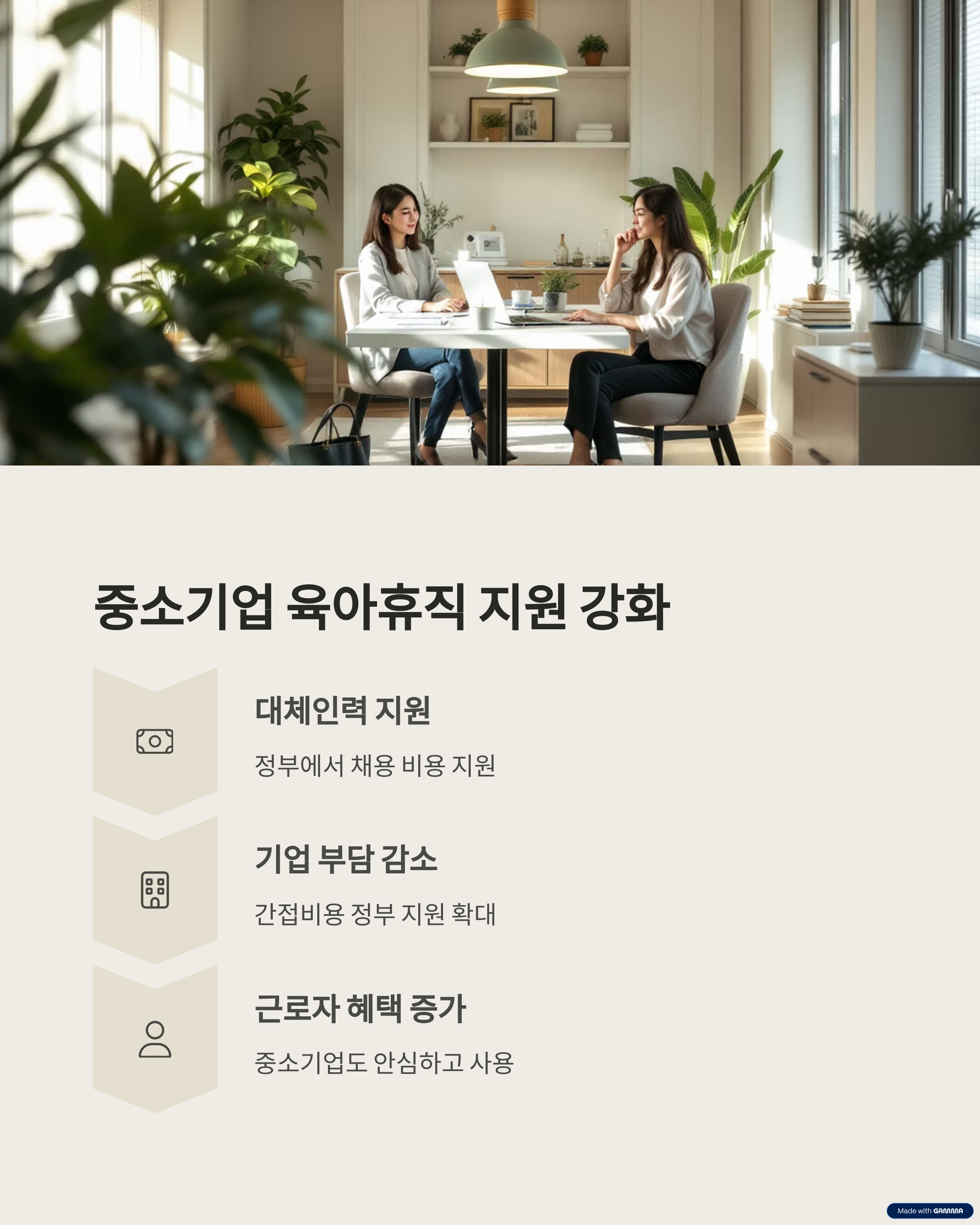 이번 개편에서는 부부 동시 육아휴직 보장, 급여 인상, 중소기업 지원 확대 등