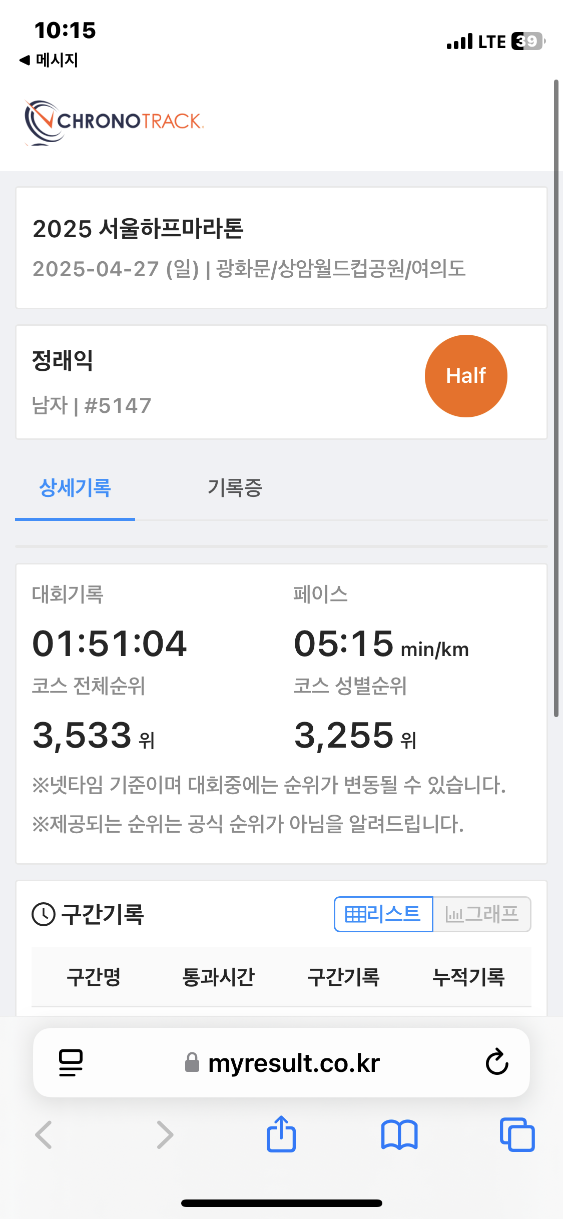 하지만 첫 하프 마라톤이었던 만큼, 기록보다는 완주와 체력 안배가 더 중요했습니다.