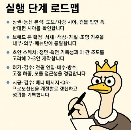 - 허가 체크: 관할 구청 옥외광고물 규정을 확인하고 필요시 신고·허가를 진행합니다.